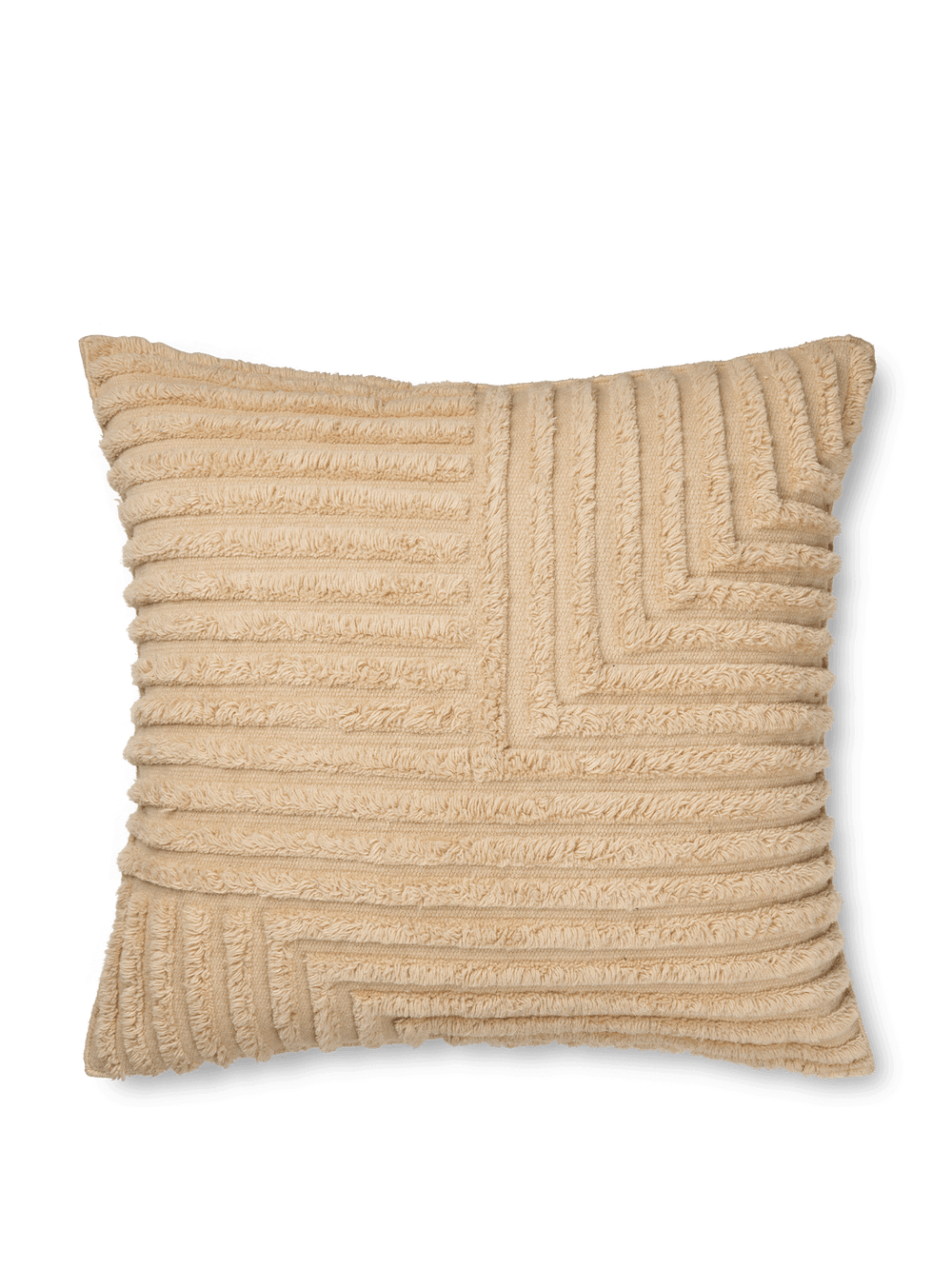 Med inspiration fra de rene linjer, der findes i moderne arkitektur, har Crease Wool Cushion et blødt, diskret udtryk. Puden er håndvævet af uld fra New Zealand, og forsiden er en blanding af høj luv og fladvævet uld, der er tuftet i et minimalistisk mønster, som giver et dekorativt, grafisk udtryk. Bagsiden af puden er udelukkende fladvævet. Puden har desuden komplicerede topsyede detaljer langs kanterne, der fremhæver dens taktilitet.